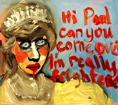 這幅名為《嗨,保羅你能過來嗎?》的畫像意在表現(xiàn)戴妃在生命最后幾個月的瘋狂狀態(tài)。兩周前,收藏界大亨查爾·沙奇以600英鎊的高價從這名失業(yè)婦女斯特拉?維恩(Stella Vine)的手中購得。此前,她從來沒有出售過她的任何一幅作品。