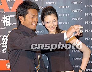 圖:古天樂簽約數(shù)碼相機代言人與模特試用自拍