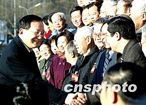 三月一日,中國國務(wù)委員唐家璇(左一)出席在北京舉行的中國人權(quán)研究會第二屆全國理事會二次會議并講話。中新社記者:鄭萍萍