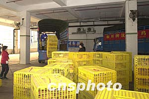 圖為澳門南粵批發(fā)市場的工作人員將首批活雞運(yùn)進(jìn)場內(nèi)。