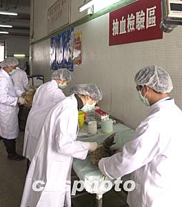 圖為在澳門南粵批發(fā)市場,醫(yī)務(wù)人員當(dāng)場將雞只抽血檢驗(yàn)。
