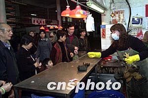 內(nèi)地五日開(kāi)始為澳門(mén)恢復(fù)活雞供應(yīng)受到澳門(mén)市民的歡迎,經(jīng)澳門(mén)衛(wèi)生檢疫部門(mén)檢驗(yàn)后雞只下午開(kāi)始在街市銷(xiāo)售,聞?dòng)嵑蟮氖忻窦娂姷绞袌?chǎng)排隊(duì)購(gòu)買(mǎi),僅一個(gè)多小時(shí),在佑漢街市銷(xiāo)售的四百五十多只活雞就基本售磬。作者:李剛