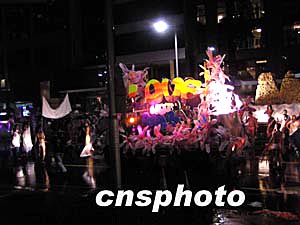 澳洲第一大城市悉尼6日晚舉行同性戀大游行,十萬(wàn)人冒雨上街看熱鬧。幾十輛花車、數(shù)千人的化裝游行隊(duì)伍在雨水中緩緩行進(jìn)。最后一輛花車上書“要愛不要戰(zhàn)爭(zhēng)”! ≈行律缬浾 劉雨生 攝