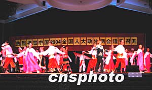 (美國(guó)東部時(shí)間)三月六日晚,來(lái)自世界各地的兩千多人參加了在紐約舉辦的二○○四年“科學(xué)、健康、文明”學(xué)術(shù)研討會(huì)。圖為大會(huì)開(kāi)幕晚宴上,與會(huì)的學(xué)子載歌載舞,祝賀中國(guó)全國(guó)人大、政協(xié)會(huì)議三月初在北京召開(kāi)。作者:陳建