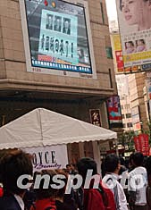 香港立法會議員李柱銘等人三月七日從美國返港,眾多市民高舉標語在機場示威抨擊,反對李柱明赴美出席聽證會。圖為在時代廣場眾多市民觀看熒屏播放的有關新聞。作者:錢興強