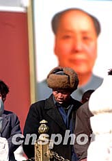 圖為一位農(nóng)民于三月份第一個(gè)周末在北京天安門前參觀游覽。中國(guó)國(guó)家總理溫家寶在日前所作的政府工作報(bào)告中有關(guān)“一年降低一個(gè)百分點(diǎn),五年內(nèi)取消農(nóng)業(yè)稅”的承諾,為全中國(guó)的農(nóng)民所矚目和期待。中新社記者:武仲林