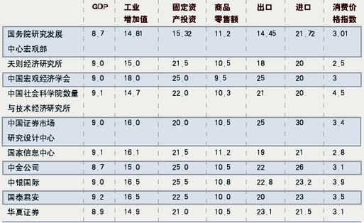 2003年中國全年GDP增長9.1%,達(dá)到1997年以來GDP的最高增速。目前經(jīng)濟(jì)學(xué)界較為一致的看法是,中長期中國經(jīng)濟(jì)仍可保持強(qiáng)勁的增長勢(shì)頭,但對(duì)于GDP能否保持去年的增速或者超過去年的增速卻有很大分歧。一種觀點(diǎn)認(rèn)為,2003年經(jīng)濟(jì)增長達(dá)到短周期波動(dòng)的波峰,2004年將進(jìn)入短周期波動(dòng)的收縮期,經(jīng)濟(jì)增長速度將出現(xiàn)小幅度下降。另一種觀點(diǎn)認(rèn)為,中國經(jīng)濟(jì)可能突破傳統(tǒng)的周期,2004年GDP增速可能再創(chuàng)新高。而《證券市場(chǎng)周刊》特邀10家機(jī)構(gòu)所作的2004年一季度宏觀經(jīng)濟(jì)預(yù)測(cè)也體現(xiàn)了這兩種不同的觀點(diǎn)。