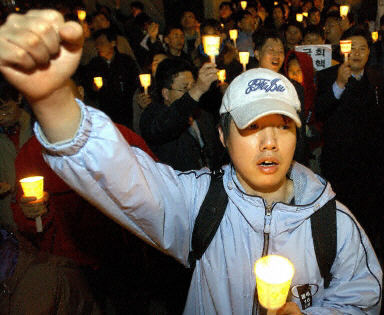 盧武鉉的一些支持者們之前在街頭游行,以示對盧武鉉的支持。