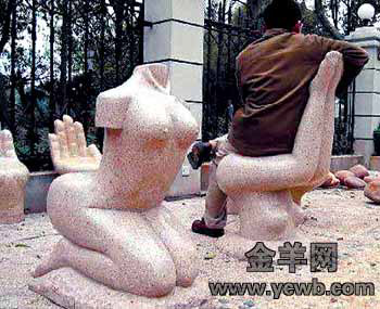 中新網(wǎng)3月13日電 “夢澤園小區(qū)竟然擺放了兩張女性裸體造型的石椅,其中一張是下跪的女人翹著臀部當椅子,另一張則是女性倒立舉起大腿給人當靠背,真是丑死了!”昨日,家住長沙蓉園社區(qū)的陳老師指著兩張人體藝術(shù)石椅,憤憤不平地說。