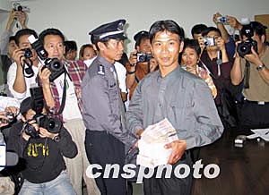 他介紹說自從公安部三月二日發(fā)布有關(guān)馬加爵的通緝令后,他始終留意這個(gè)信息。三月十五日晚七時(shí)左右他騎摩托車經(jīng)過三亞河西岸,前往第一市場買菜。發(fā)現(xiàn)路邊有一男子在路邊垃圾桶翻撿別人丟棄的食物和飲料,他覺得此人相貌與通緝令上的照片非常想像,他立刻與到處都粘貼的通緝令對照,認(rèn)為比較確定。在與馬犯對視的過程中,他還發(fā)現(xiàn)此人在裝瘋并且走路一瘸一拐。他立刻騎摩托前往三亞河西派出所報(bào)案。