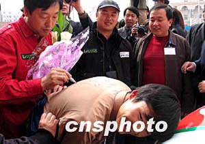 三月十八日,中國(guó)車王盧寧軍和他的“座騎”中國(guó)出產(chǎn)的帕拉丁汽車亮相蘭州,熱情的車迷請(qǐng)盧寧軍為在衣服上簽名。作者:劉呈軍