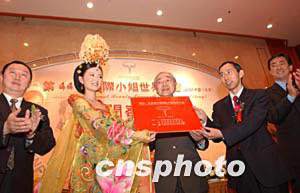 3月18日,“第44屆國際小姐世界大會”組委會在北京宣布,“國際小姐世界大會”將于10月18日在北京舉辦。曾參加“2003年國際小姐世界大會”并獲得最佳民族服飾小姐獎的王珊和日本國際文化協(xié)會會長伊達邦美(右三)、中國國際文化傳播中心會長龍宇翔(右二)一同出席交接儀式。中新社記者:盛佳鵬