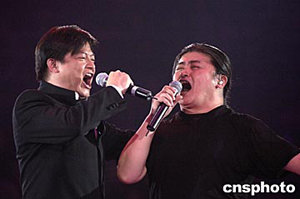 “歡歌2004演唱會(huì)”在座無虛席的首都體育館隆重上演,中國內(nèi)地歌手劉歡(右)與特邀嘉賓香港歌手莫華倫一起為到場歌迷獻(xiàn)上了眾多耳熟能詳?shù)母枨W髡?高遠(yuǎn)