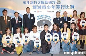 《恒生銀行之協(xié)助警方撲滅青少年罪行比賽2004》舉行揭幕儀式。出席儀式的主禮嘉賓及眾歌星藝員于揭幕儀式上合照。作者:鄧慶樂