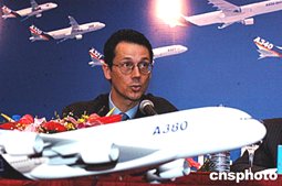 空中客車公司價格政策高級副總裁奧利維安德列斯,三月二十四日在北京介紹擁有555個座位的超大型飛機(jī)-A380飛機(jī),并對中國市場前景極為樂觀。首架A380飛機(jī)今年五月開始總裝,二零零六年計劃投入運(yùn)營。作者:王麗南