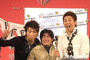 三月二十五日,羽泉組合在北京宣布,將于今年五月在北京首都體育館舉行名稱為“紅五月”的演唱會。圖為發(fā)布會上羽泉組合與歌迷一道接受中國歌曲排行榜的頒獎。作者:高遠(yuǎn)