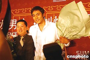 三月二十六日,金馬影帝劉燁(右)在北京凱賓斯基酒店與著名服裝品牌圣馬龍簽約,成為該品牌的形象代言人。中新社記者:武仲林