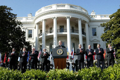 29日,美國(guó)總統(tǒng)布什在白宮對(duì)加入“北約”的7國(guó)表示了歡迎談話(huà)。北約將于4月2日在布魯塞爾總部舉行典禮,慶祝北約東擴(kuò)。但事實(shí)上從29日起,該7國(guó)已開(kāi)始被正式視為“北約”成員。“北約”成員國(guó)已增加到26國(guó)。