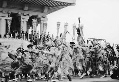 在此樂章中,各種道具將古老的巫舞和氏族的篝火舞相結(jié)合,服飾則采用了遠古時期的巖畫、圖騰紋、甲骨文和象形寫意。12名扮鳳凰的少女、12名扮各種動物的男子和12名頭戴圖騰面具的“部落首領(lǐng)”,手持羽毛編織的鳳旗、花桿等飾物,手牽手,揮舞著鳥羽、獸尾、圖騰柱踏歌而舞……