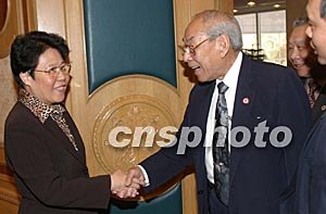 四月二日,中國(guó)國(guó)務(wù)院僑辦主任陳玉杰(左)在北京新世紀(jì)飯店會(huì)見來(lái)華的美國(guó)安良工商會(huì)訪問(wèn)團(tuán)全體成員。中新社記者:史利