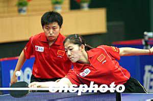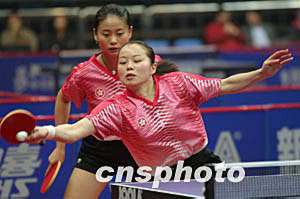 奧運(yùn)乒乓球亞洲預(yù)選賽雙打比賽第二階段四月十二日晚在北京海淀體育館開賽,牛劍鋒(前)、郭躍零比四輕取中國(guó)香港選手帖亞娜、桑婭嬋,獲得六連勝,宣告成功進(jìn)軍雅典奧運(yùn)。中新社記者:盛佳鵬