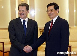 中新社北京四月十四日電(記者 齊彬)中國國家主席胡錦濤今天下午在人民大會(huì)堂會(huì)見了歐盟委員會(huì)主席普羅迪,賓主雙方進(jìn)行了友好談話。