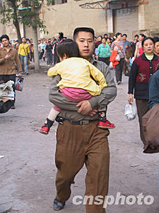 四月十八日下午六時(shí)許,離事發(fā)地中央核心區(qū)域僅兩公里的螞蝗梁拉起的警戒線終于撤下.疏散出去的附近居民歸心似箭。圖為一位父親抱著年幼的女兒快步走在回家的路上。作者:郭晉嘉 郭虹