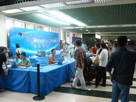博鰲亞洲論壇2004年年會(huì)于4月24日在海南博鰲開(kāi)幕。本次論壇年會(huì)主題為“亞洲尋求共嬴——一個(gè)對(duì)世界開(kāi)放的亞洲”,表明2004年博鰲亞洲論壇年會(huì)將在全球背景下,探討亞洲各國(guó)和地區(qū)區(qū)域經(jīng)濟(jì)合作問(wèn)題,尋求亞洲共同進(jìn)步的有效途徑。圖為忙碌的海口美蘭機(jī)場(chǎng)博鰲亞洲論壇年會(huì)接待處。(春風(fēng))