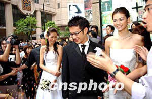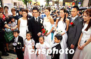 日本美容品牌Miryoku在香港首度開設(shè)Miryoku Beauty Salon美容院,4月24日舉行開幕儀式,邀請城中藝人吳浩康[左二]、陳鍵鋒[右二]、名模Rosemary[左三]和李嘉慧[右三]出席,俊男美女穿上婚紗禮服在花童和伴娘的襯托下,由鬧市步入會場。作者:洪少葵