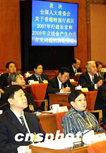 第十屆全國人民代表大會常務(wù)委員會第九次會議審議了香港特別行政區(qū)行政長官董建華2004年4月15日提交的《關(guān)于香港特別行政區(qū)2007年行政長官和2008年立法會產(chǎn)生辦法是否需要修改的報告》,并在會前征詢了香港特別行政區(qū)全國人大代表、全國政協(xié)委員和香港各界人士、全國人大常委會香港特別行政區(qū)基本法委員會香港委員、香港特別行政區(qū)政府政制發(fā)展專責(zé)小組的意見,同時征求了國務(wù)院港澳事務(wù)辦公室的意見。全國人大常委會在審議中充分注意到近期香港社會對2007年以后行政長官和立法會的產(chǎn)生辦法的關(guān)注,其中包括一些團體和人士希望2007年行政長官和2008年立法會全部議員由普選產(chǎn)生的意見。