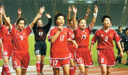 下半時(shí)15分鐘,曲飛飛接到浦瑋的傳球后,并沒有急于出腳,她在冷靜的調(diào)整、撥球后,在最合適的位置起腳,韓國隊(duì)門將金正美努力地伸出右臂,但飛飛的射門力拔千鈞。范運(yùn)杰、滕巍、浦瑋興奮得恨不得把飛飛按倒在地。直到下半時(shí)35分鐘,海濤才舍得用張穎換下飛飛,因?yàn)轱w飛的腿已經(jīng)被對方踢得青一塊紫一塊。