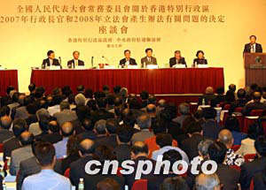 根據(jù)全國人大常委會今天上午就香港政制問題作出的決定,二OO七年行政長官和二OO八年立法會的選舉,均不實行普選產(chǎn)生的辦法;立法會的功能團體和分區(qū)直選產(chǎn)生的議員各占半數(shù)的比例維持不變,立法會對有關(guān)法案、議案的表決程式維持不變。在此大前提下,二OO七年行政長官和二OO八年立法會的具體產(chǎn)生辦法,可按《基本法》有關(guān)規(guī)定作出符合循序漸進原則的適當(dāng)安排。