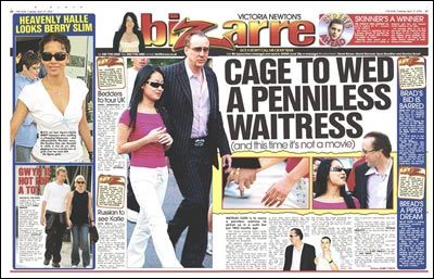 美國娛樂雜志《Bizarre》在最新一期中報道說:“尼古拉斯·凱奇將和身無分文的19歲餐廳服務生愛麗斯·金結婚。這不是電影,而是活生生的事實!