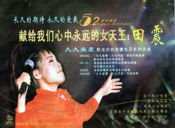 作為國(guó)內(nèi)首次歌迷自發(fā)集資為偶像購(gòu)買生日廣告的發(fā)起者,田震歌迷會(huì)的會(huì)長(zhǎng)張寧寧向記者介紹了他們的想法。“這是我們一年前的想法了,整個(gè)廣告也都是我們歌迷會(huì)的成員自己設(shè)計(jì)的!睂(duì)于田震近一兩年的低調(diào)表現(xiàn),始終擁護(hù)她的歌迷不甘心自己的偶像沒有音訊,因此他們決定在田震2004年生日到來的時(shí)候,用一系列的特別舉動(dòng),為偶像造勢(shì)!百I廣告位只是我們系列慶;顒(dòng)中的一項(xiàng),我們還與門戶網(wǎng)站新浪合作,推出‘久久愛震-九九評(píng)選’活動(dòng),大家還要在5月1日自發(fā)趕赴田震當(dāng)天在山東聊城的演出現(xiàn)場(chǎng)高舉生日快樂的橫幅為她慶祝等!