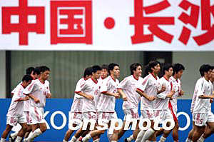 四月三十日,中國(guó)國(guó)奧足球隊(duì)在湖南長(zhǎng)沙賀龍?bào)w育場(chǎng)進(jìn)行場(chǎng)地適應(yīng)性訓(xùn)練,為五月一日晚迎戰(zhàn)韓國(guó)國(guó)奧隊(duì)做準(zhǔn)備。中新社記者:盛佳鵬