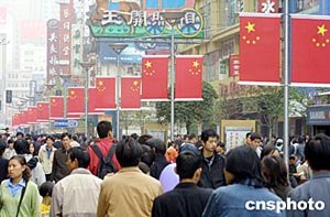 “五一黃金周”的第一天,上海街頭人頭攢動,鮮紅的國旗洋溢著濃濃的節(jié)日氣氛。作者:湯彥俊