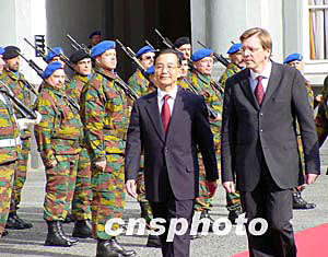 溫家寶抵達(dá)布魯塞爾時(shí),受到比利時(shí)王國(guó)、歐盟委員會(huì)有關(guān)官員、中國(guó)駐比利時(shí)大使兼駐歐盟使團(tuán)團(tuán)長(zhǎng)關(guān)遠(yuǎn)呈和當(dāng)?shù)厝A僑華人的熱烈歡迎。