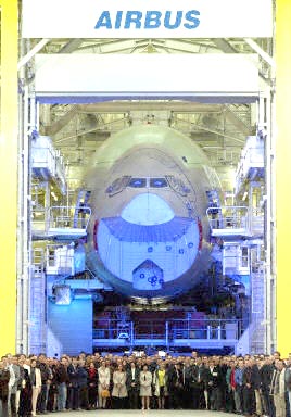 5月7日,在法國(guó)西南部城市圖盧茲空中客車公司總部,世界上最大的客機(jī)空客A380開(kāi)始總裝。該公司稱,空客A380將于2005年首飛,2006年投入運(yùn)營(yíng)。