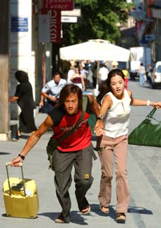 這場驚心動魄的追逐戲在雅典市中心憲法廣場拍攝,由于現(xiàn)場人潮擁擠,許多人根本不曉得在拍戲,加上何潤東與蔡琳拎個大卡行李箱,活像對亡命鴛鴦,引起很多路人側目。
