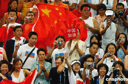 當(dāng)?shù)貢r間8月19日,在中國選手張寧與荷蘭選手之間進(jìn)行了女子羽毛球單打比賽的決賽,圖為場外觀眾為中國隊(duì)吶喊助威。