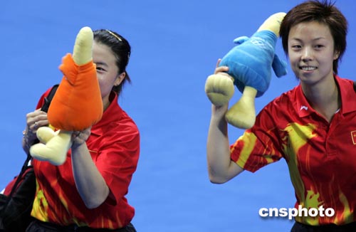 當?shù)貢r間8月20日下午,中國乒乓球選手王楠、張怡寧在決賽中以4比0輕取韓國選手,獲得本屆奧運會女子雙打冠軍。中新社記者:任晨鳴