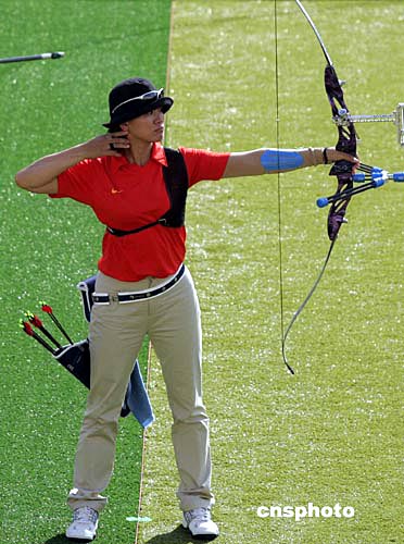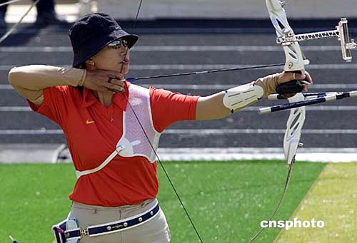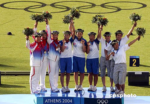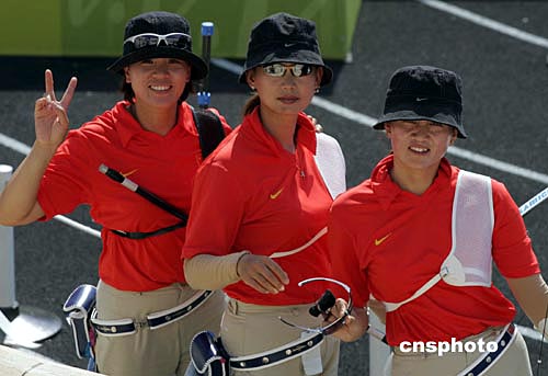當?shù)貢r間8月20日下午,中國女子射箭隊(左)獲得雅典奧運會女子射箭團體銀牌,中國臺北隊(右)獲得銅牌,實力雄厚的韓國隊奪得冠軍。中新社記者:張煒