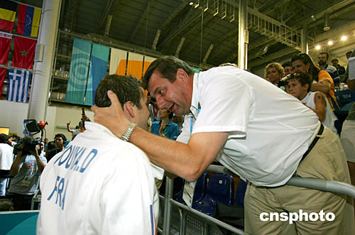 圖為在法國隊奪取男子配劍團體冠軍后,法國體育部長拉穆爾擁抱選手的場面。