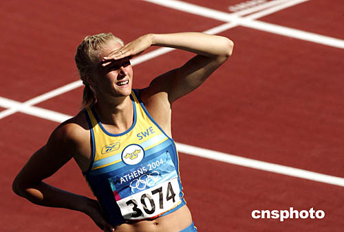 圖為瑞典選手克魯芙特(Carolina Kluft)在七項(xiàng)全能100米欄比賽結(jié)束后,注視記分牌的鏡頭。
