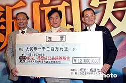 八月二十一日,成龍、楊受成公益慈善基金在北京人民大會堂成立。國際著名影星成龍和香港英皇集團主席楊受成捐助一千二百萬元人民幣為創(chuàng)始基金,用于中國老人、婦女、兒童、及貧困人員的公益慈善事業(yè)。中新社記者:史利