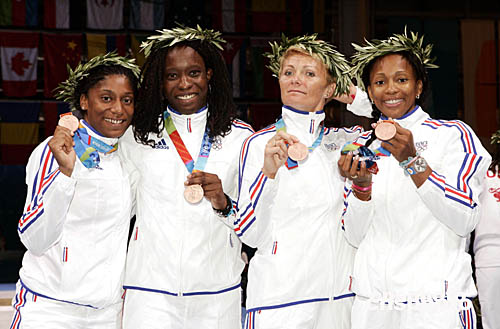 在女子重劍團體比賽中奪得銅牌后,法國隊員們登上領(lǐng)獎臺露出燦爛的笑容。