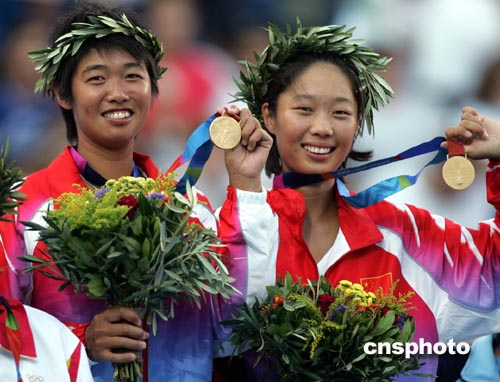 中新社雅典八月二十二日電 當(dāng)李婷/孫甜甜在剛剛結(jié)束的雅典奧運(yùn)會(huì)網(wǎng)球女子雙打決賽中為中國(guó)再添一金,中國(guó)在本屆奧運(yùn)超過美國(guó),重登金牌榜首位。