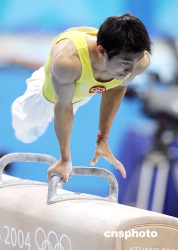 中新社雅典八月二十二日電 (記者 宋方燦)雅典奧運(yùn)會(huì)體操鞍馬比賽今天晚上進(jìn)行,中國(guó)兩名選手參加了比賽。滕海濱在比賽中發(fā)揮出自己的水平,以九點(diǎn)八三七分摘取金牌。