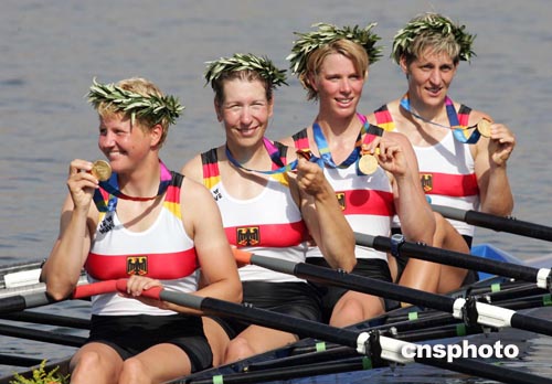 當(dāng)?shù)貢r間八月二十二日,德國隊在雅典奧運(yùn)女子四人雙槳賽艇比賽中獲得冠軍。中新社記者:毛建軍