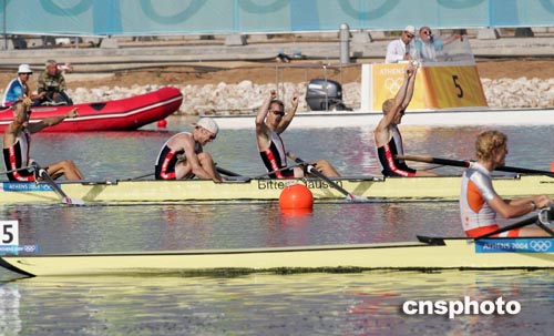 當(dāng)?shù)貢r間八月二十二日,丹麥選手獲得雅典奧運男子四人單槳賽艇比賽冠軍。中新社記者:毛建軍